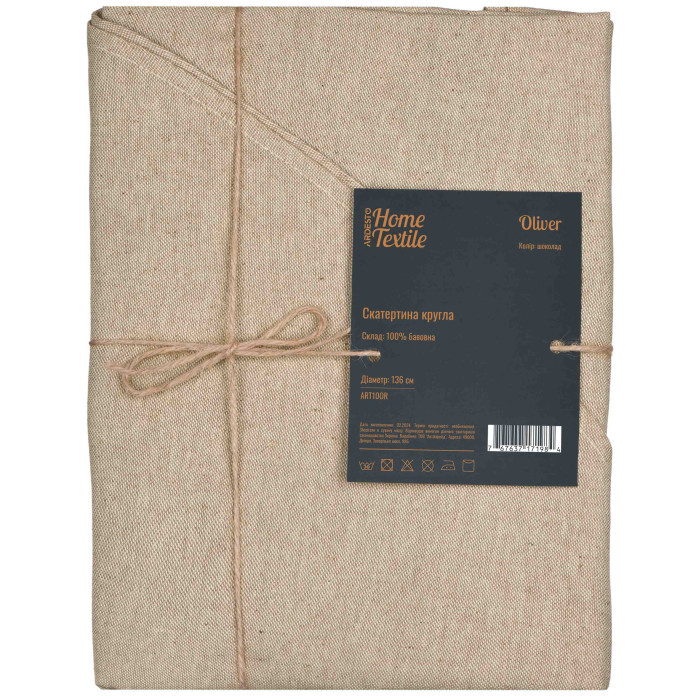 Стильна скатертина Oliver вдало доповнить інтер’єр їдальні чи кухні. Вироблена зі 100 % бавовни, вона вирізняється зносостійкістю та легкістю щодо догляду, проте для збереження первинного вигляду все ж варто зважати на рекомендації: прати в машині за делікатного режиму (30 °C); не сушити в сушильній машині, а тільки у вертикальному положенні; прасувати за температури до 150 °C; також заборонено відбілювання та хімчистка. Скатертина діаметром 136 см оптимально згодиться для круглих столиків, а з огляду на елегантний колір (шоколад) вона гармонійно пасуватиме до різних стилів сервірування.