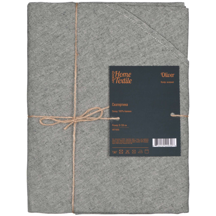 Вдало підібрана скатертина – це не тільки прикраса, але й незамінна деталь на кухні. Кругла скатертина ARDESTO Oliver зеленого кольору – надійний і якісний боєць на полі краси та чистоти обіднього столу. Крім того, вона приховає дефекти столу, захистить його від пошкоджень та забруднення, перешкоджатиме ковзанню посуду та приглушатиме звук посуду та столового приладдя під час пересування. Діаметр виробу 136 см, призначений для столу до 90 см.