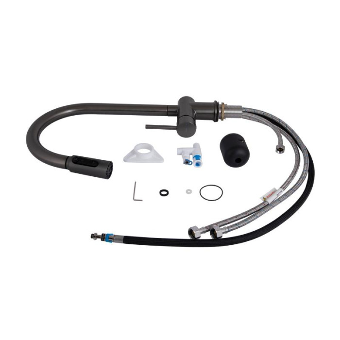 Смеситель, шланги подключения, шланг под фильтрованную воду, крепежные детали.