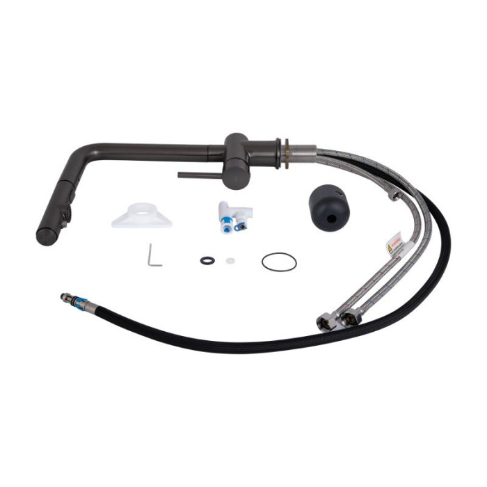 Смеситель, шланги подключения, шланг под фильтрованную воду, крепежные детали.