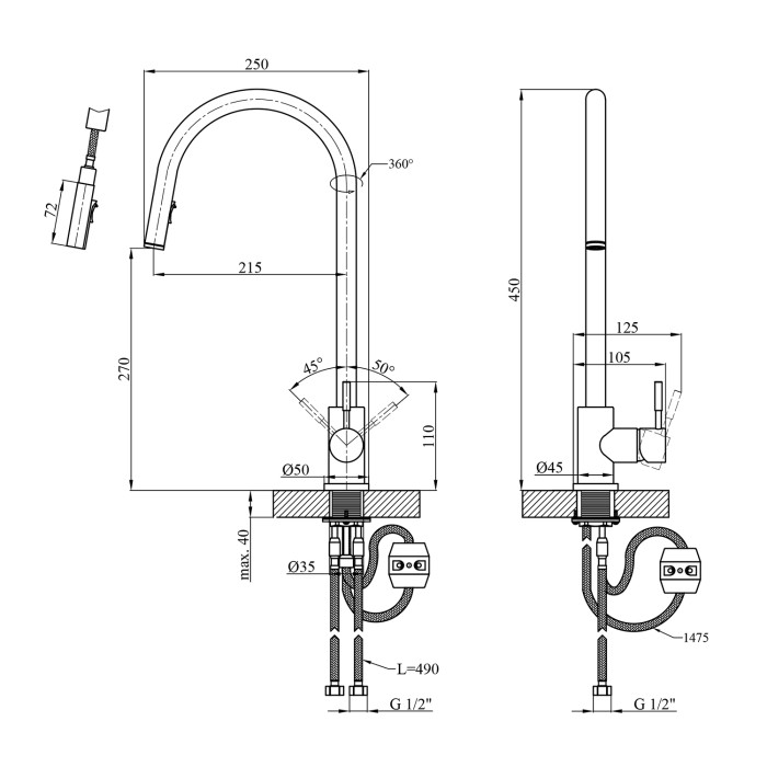 Змішувач для кухні з висувним виливом Kroner KRP Edelstahl Klassisch - ESG03915