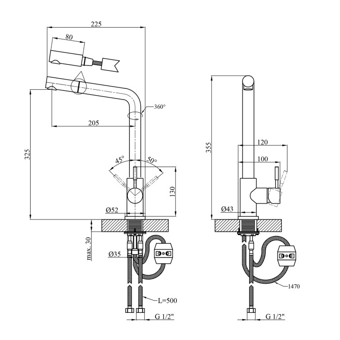 Висувний вилив та поворотний вилив: Забезпечує зручність при використанні та збільшує область робочого простору на кухні.