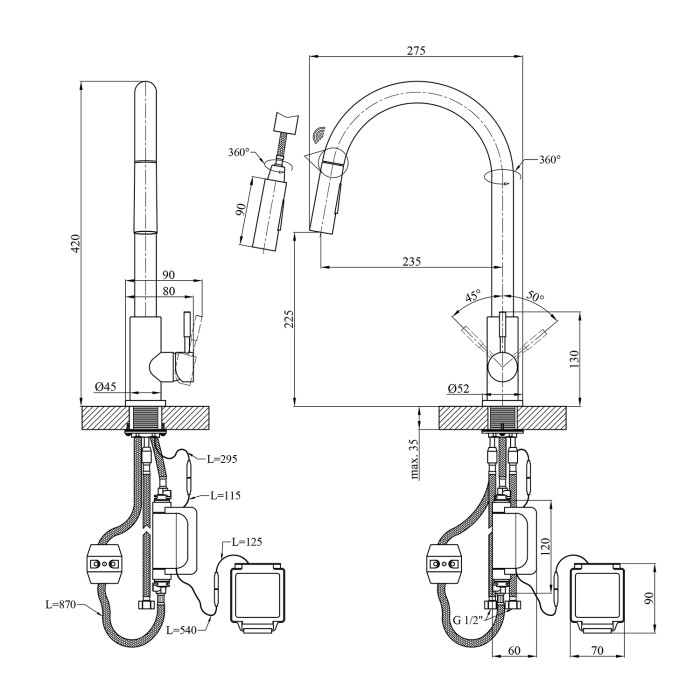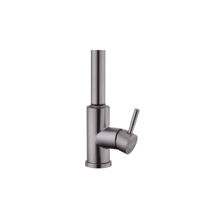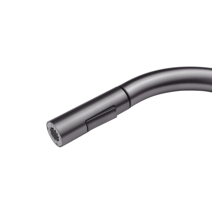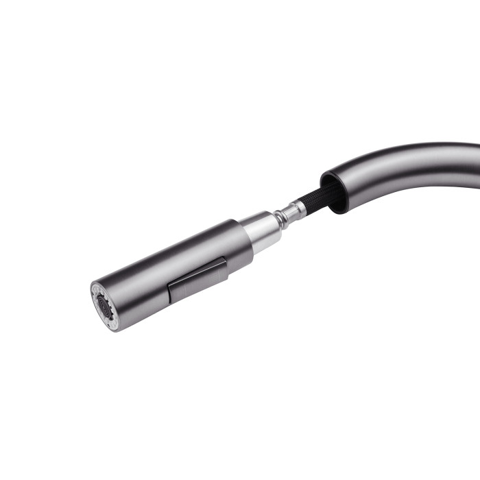Змішувач має лаконічний дизайн та високу функціональність. Висувна лійка має шарнір, що забезпечує обертання на 360 градусів. Два режими розпилення – від потокового струменя без бризок до потужного струменя душу – дозволяють ефективно виконувати різні завдання, такі як ополіскування посуду або видалення забруднень.
