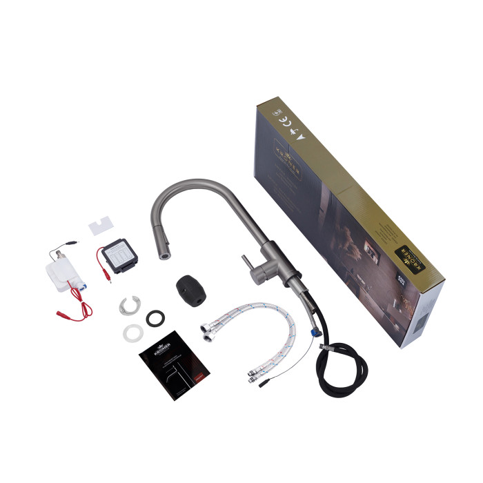 Змішувач, гнучка підводка, шланг для висувної лійки, лійка, якір, електромагнітний клапан, блок живлення, кріплення.