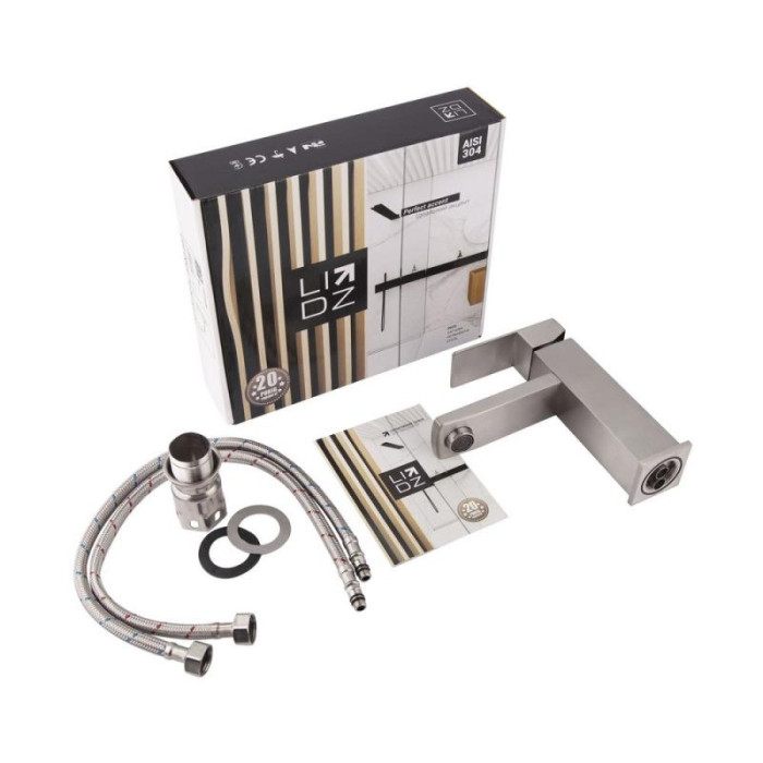 Смеситель для раковины Lidz (NKS) 10 30 001 00 изготовлен из нержавеющей стали, которая не подвержена коррозии, устойчива к ударам и трещинам. Никелированная брашированная поверхность придает смесителю не только долговечность, но и оригинальный внешний вид. Интенсивность водного потока и температура регулируются с помощью перемещения рычага. Подключение воды происходит через гибкие шланги с диаметром подключения 1/2", которые входят в комплект поставки.