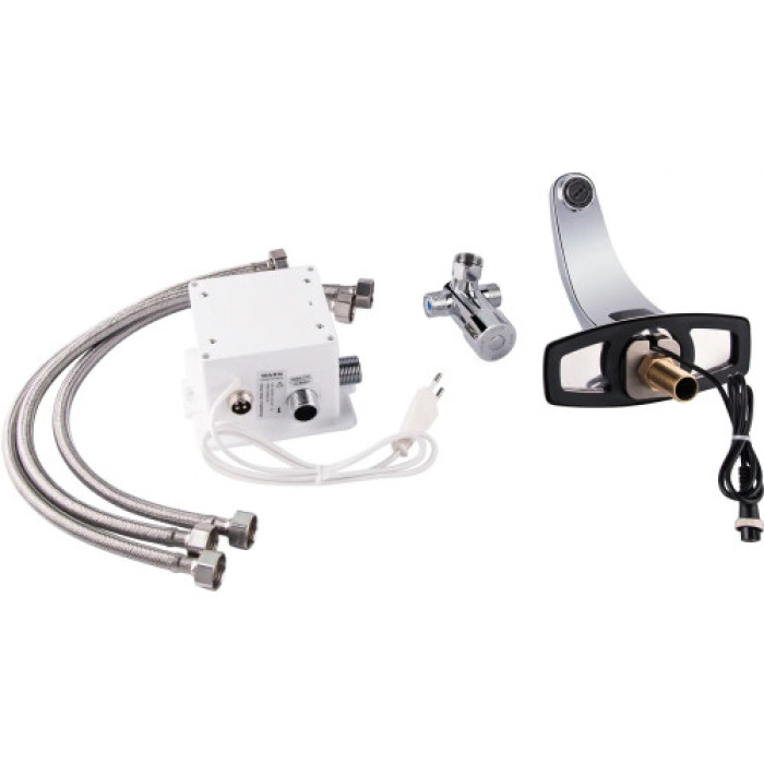 Смеситель, гибкая подводка, блок питания, крепежи.