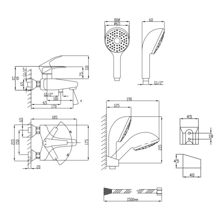 Смеситель, лейка для ручного душа, душевой шланг, держатель для ручного душа, крепеж.