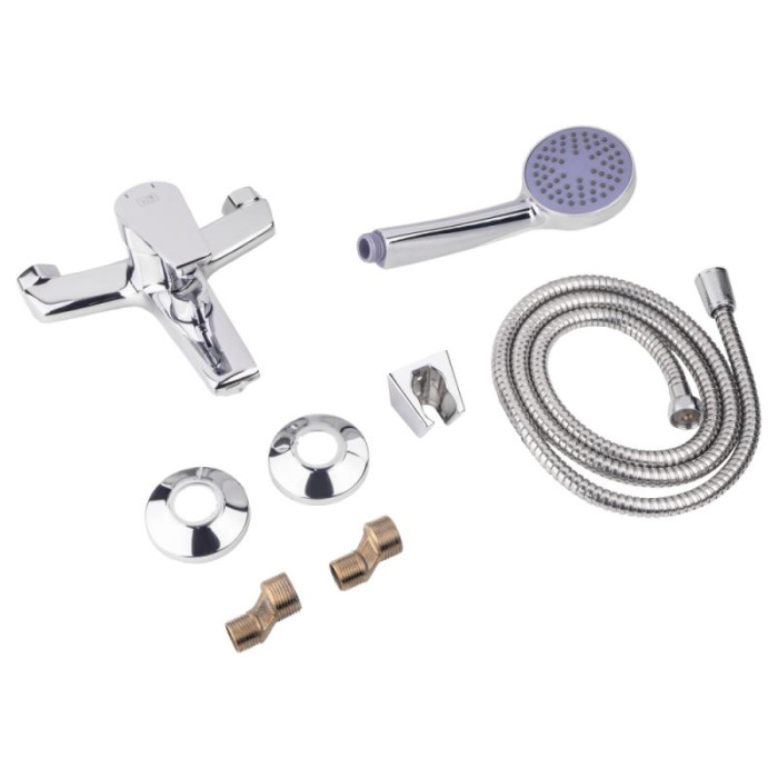 Смеситель, лейка для ручного душа, душевой шланг, держатель для ручного душа, крепежи.