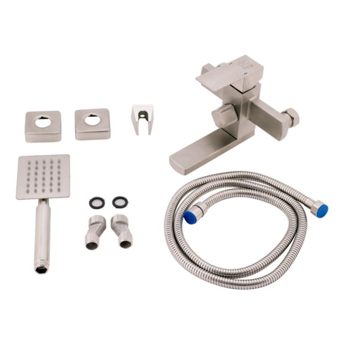 Смеситель, лейка для ручного душа, душевой шланг, кронштейн для ручного душа, крепежи.