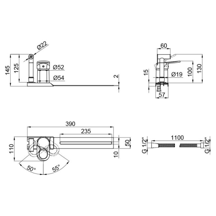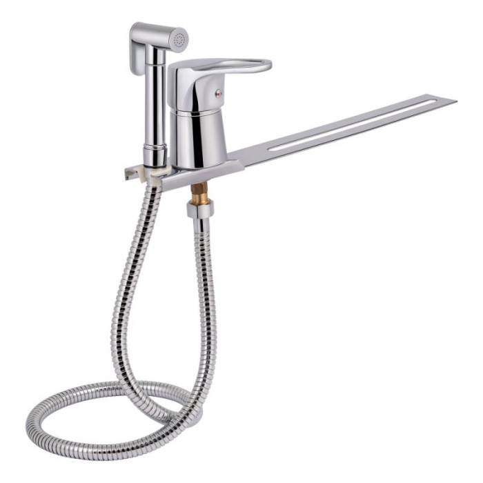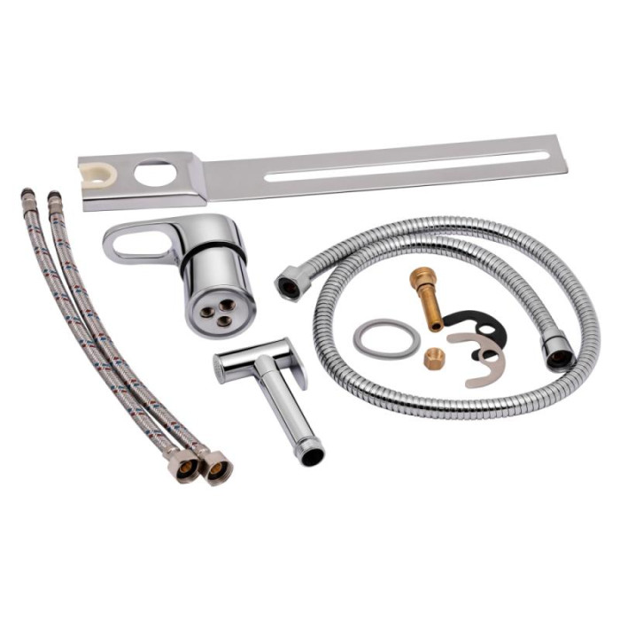 Смеситель, душевой шланг, лейка для гигиенического душа, рейка, крепежи.