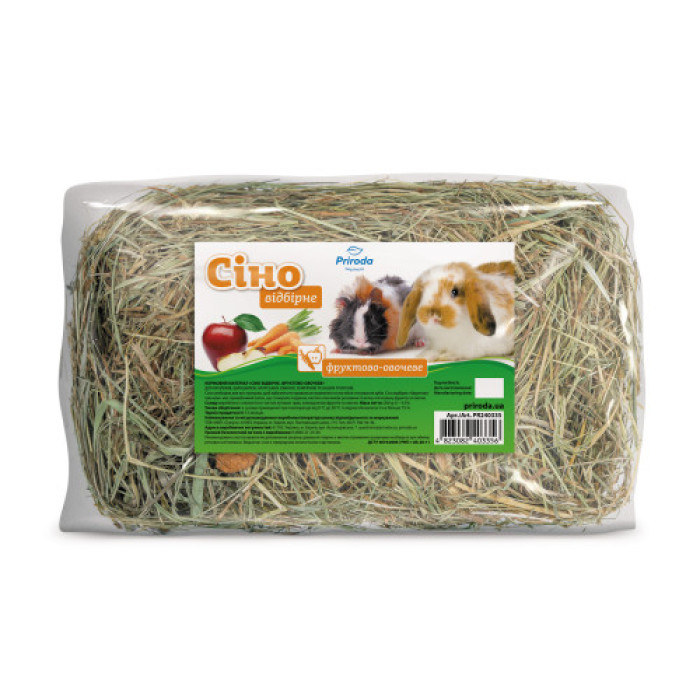 Сіно необхідне для всіх гризунів, щоб забезпечити правильне травлення та постійне сточування зубів. Сіно «Фруктово-овочеве» має привабливий запах, що пробуджує апетит улюбленців.