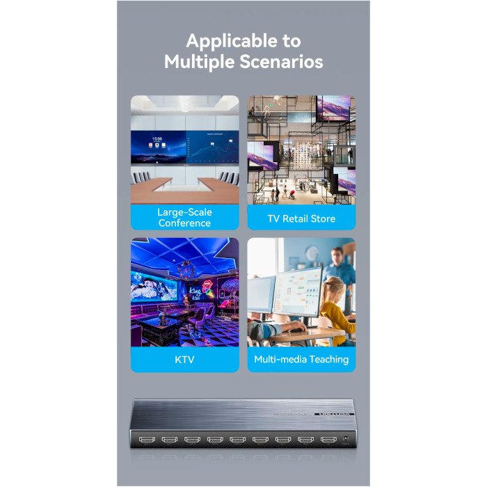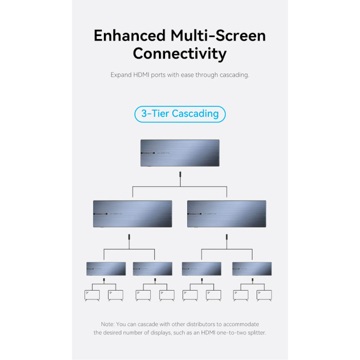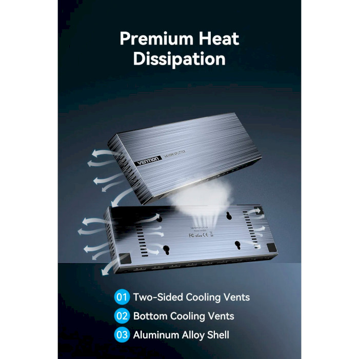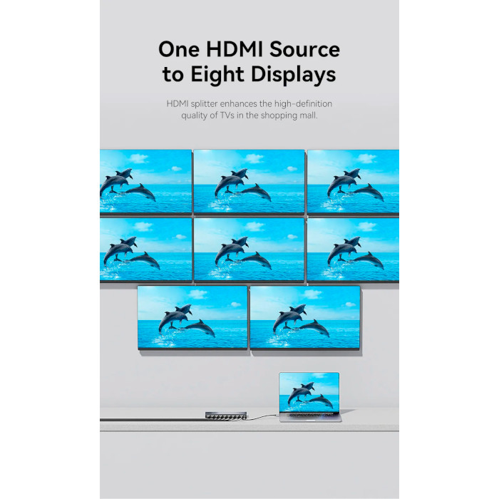 Спліттер Vention 1-in-8 Out HDMI Splitter 4K@30Hz призначений для передачі цифрового аудіо та відео HDMI сигналу від одного HDMI-джерела (комп'ютер, медіаплеєр, DVD-програвач, ноутбук тощо) одночасно на 8 пристроїв з входом HDMI (телевізор, плазмова панель, проектор, монітор тощо).Розгалужувач також посилює передачу сигналу до 30 метрів, що дозволяє використовувати кабель більшої довжини (до 15 метрів від джерела до розгалужувача і до 15 метрів від розгалужувача до дисплея).