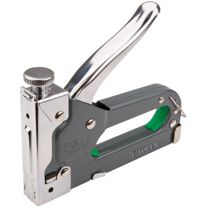 Степлер TOPEX працює зі скобами типу G, розміром від 6 до 14 мм. Металевий корпус гарантує міцність інструменту. Степлер призначений для важких робіт, для кріплення матеріалів великої товщини. Завдяки регулюванню сили забивання скоб, степлер може використовуватися для роботи як з твердими, так і з м'якими матеріалами. Точно забиває скоби, не деформуючи їх, в тому числі при роботі з твердими матеріалами. Бренд TOPEX призначений для домашніх майстрів.