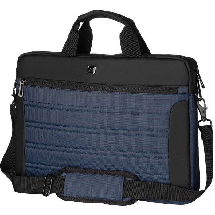 Сумка синього кольору з чорними вставками для повсякденного використання. Виконана з водовідштовхуючого нейлону в комбінації з матеріалом дна і стінок, що амортизує поштовхи та удари.