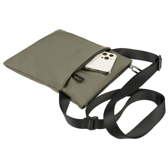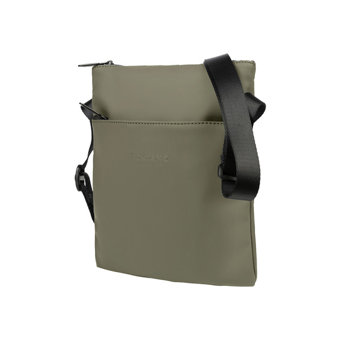 Компактна повсякденна сумка через плече Tucano Gommo Shoulder Bag. Сумка через плече Gommo Shoulder Bag тонка, має зовнішню кишеньку для аксесуарів і регульований плечовий ремінець. Матеріал сумки виготовлено з прогумованого матеріалу, а також внутрішньою системою захисту від радіо-випромінювання і здатна запропонувати значний захист від електромагнітних хвиль, які випромінюють смартфони.