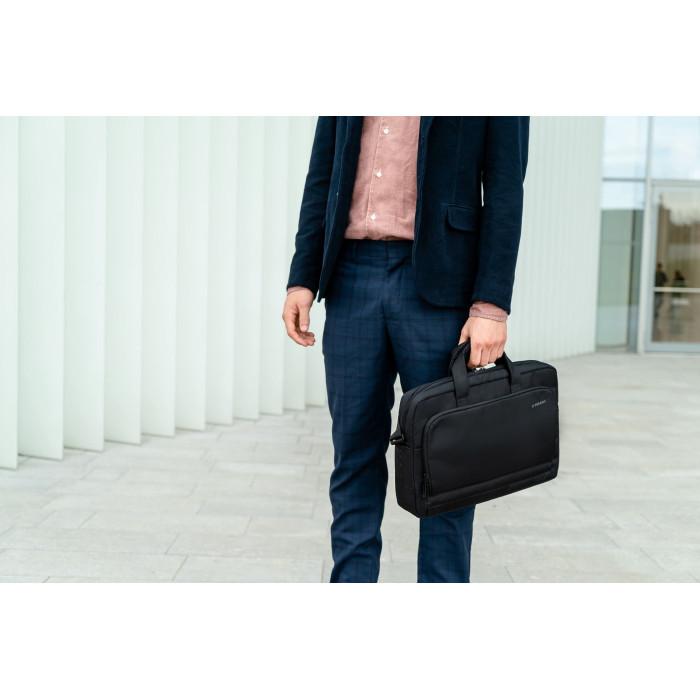 Tucano Star BSTN-BK — компактна та легка сумка-книжка для ноутбуків 15.6" та MacBook Pro 15/16". Виготовлена з міцного зносостійкого поліестеру, з м'яким внутрішнім відділенням для ноутбука та сітчастою кишенею на блискавці. Передня кишеня-органайзер для смартфона та аксесуарів, регульований плечовий ремінь. Вага всього 0.42 кг, розміри 40 × 29.5 × 8.5 см. Стильний чорний дизайн для щоденного використання.