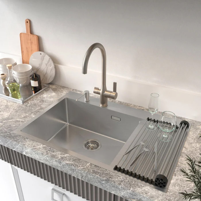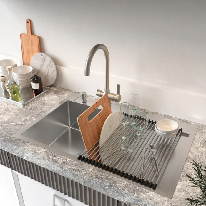 Сушарка-килимок для посуду Kroner KRP Matte - SCH4333-2 виконана з харчового силікону та нержавіючої сталі. Сушіння такого типу називається трофлексом, встановлюється поверх миття або на стільницю. Важливою перевагою цього типу сушіння є те, що вона завжди під рукою і на неї можна складати не тільки посуд, але, наприклад, і мити овочі, а також можна використовувати для розміщення гарячих каструль і сковорідок. Сушіння скочується в рулон і не займає багато місця, а при необхідності швидко розкладається для сушіння посуду або овочів.