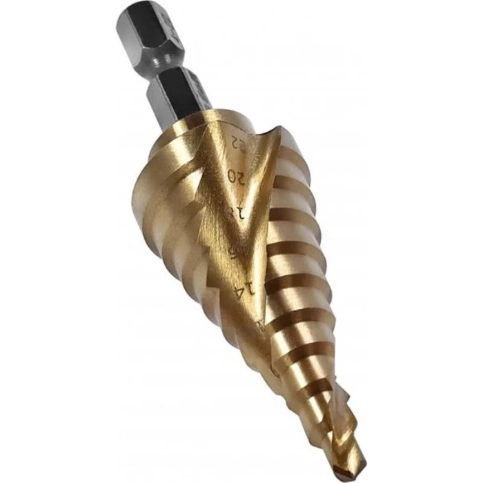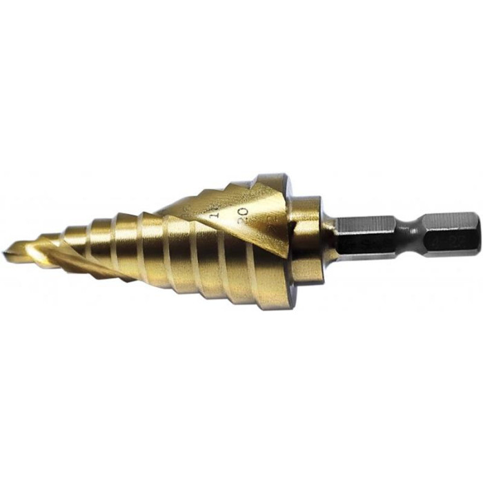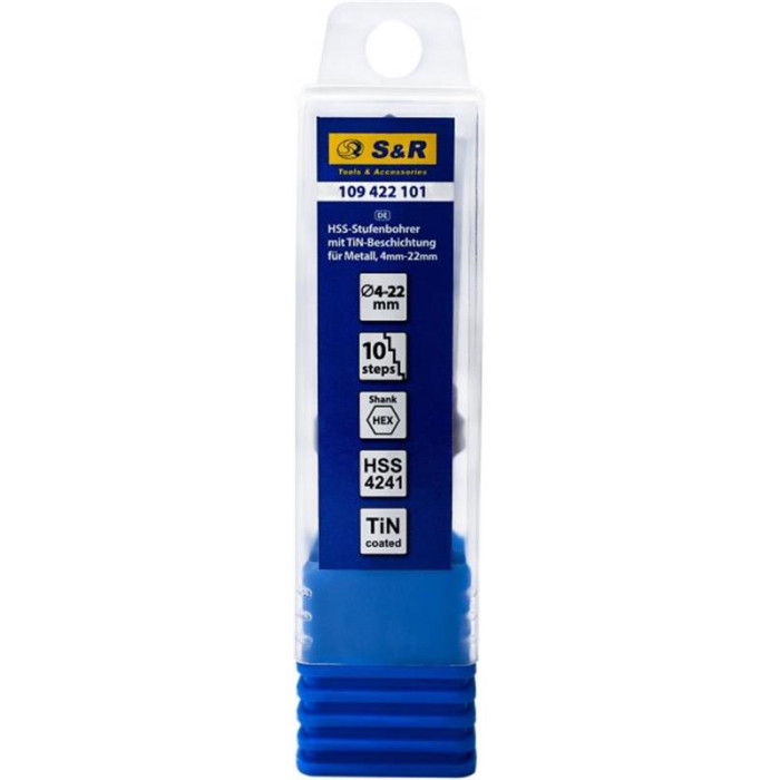 Свердло для металу S&R ступеневе — призначене для свердління і зняття фаски в металі та неіржавкій сталі. Свердло виготовлено зі швидкорізальної сталі. Титанове покриття збільшує ресурс роботи свердел і забезпечує тривалий термін експлуатації. Має дві широкі спіралі для виведення стружки.