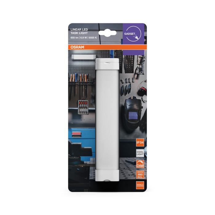 Підвісний акумуляторний світильник OSRAM LINEAR TASKLIGHT — це мобільне LED-рішення потужністю 6.9 Вт із світловим потоком 400 лм та холодною температурою світла 6500 К. Модель працює від вбудованого акумулятора 2200 мА·год, підтримує димерування та заряджається через USB-A → microUSB. Оснащена кількома варіантами встановлення, придатна для приміщень і для використання на відкритому повітрі.