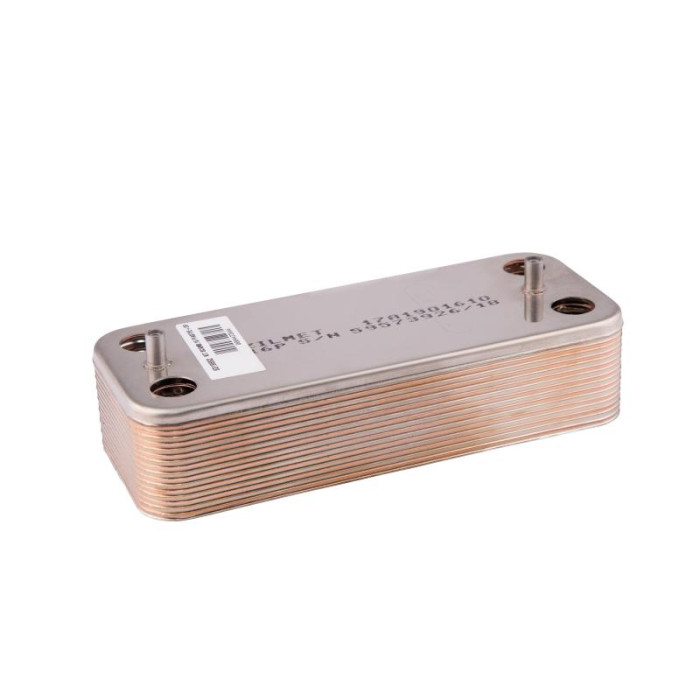 Пластинчатый т.о. 16 пластин для газовых котлов Sime обеспечивает обмен теплом между двумя средами. Происходит это за счет передачи энергии от горячей жидкости, поступающей из котла, к жидкости которую необходимо нагреть. В теплообменнике потоки движутся в противоположном направлении, при этом выходное отверстие одного потока находится рядом с входным отверстием другого. Благодаря этому не происходит резкого перепада температур, что продлевает срок службы теплообменника и отопительного котла.