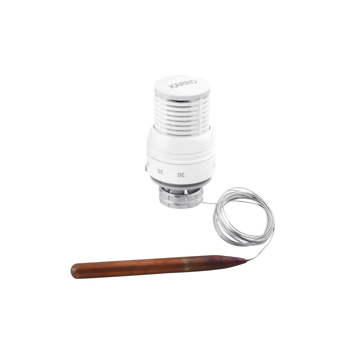 Термоголовка Karro M30x1.5 з виносним капіляром KR-2031 і занурювальним датчиком рідинного типу. З'єднується з датчиком мідною капілярною трубкою довжиною 2м. Термоголовка являє собою спеціальний механізм у системі опалення, який встановлює температуру в приміщенні на заданому рівні. В основі термоголовки закладено рідинне наповнення, в результаті розширення якого і відбувається робота термоголовки. Виносний датчик (занурювальний) встановлюється біля радіатора (до труби прямої лінії) або занурюється у воду за допомогою гільзи. Діапазон реєстрації температур від +30°С до +70°С.