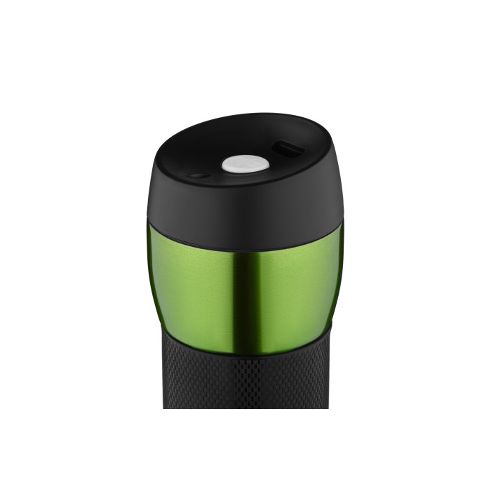 Термочашка на 450 мл з вакуумною технологією зберігання температури – до 8 годин для гарячих напоїв, та 12 годин для холодних. Зовнішня металева частина пофарбована у зелений колір з глянсовою текстурою. Для зручності передбачено силіконове покриття під долоню. Внутрішня частина виконана з нержавіючої сталі 18/10. Нековзка основа запобігає перевертанню, а пластикова кришка отримала силіконову прокладку та кнопку відкриття отвору для пиття.