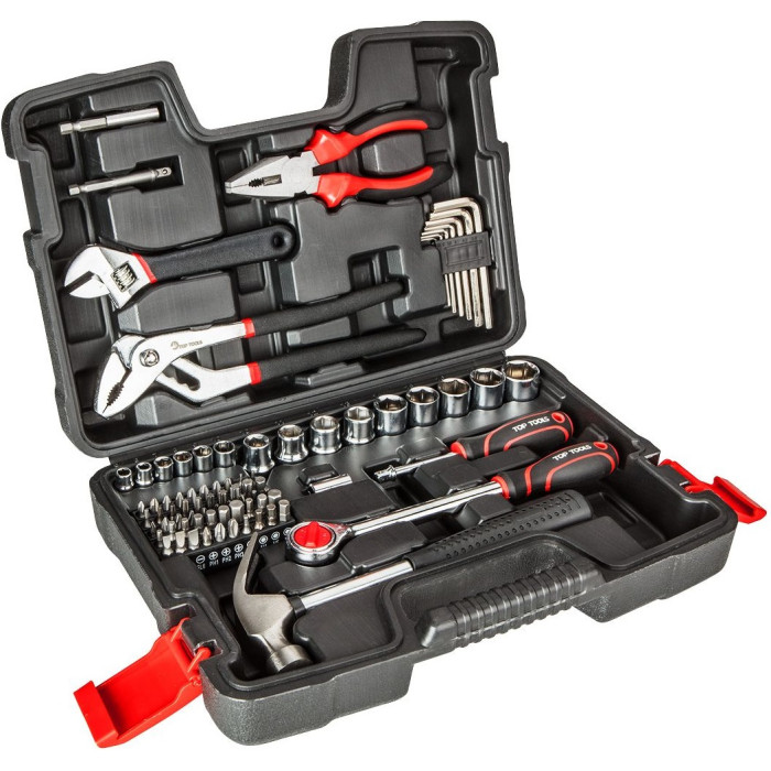 Універсальний набір ручного інструменту Top Tools 38D510 1/2" та 1/4" що складається з 81 предмета, упакованих у міцний пластиковий кейс. Набір призначений для виконання всіх найпоширеніших завдань по дому. В комплект входить повний набір шестигранних торцевих головок двох розмірів, тріскачки та приладдя. Універсальність набору підвищується завдяки наявності універсальних плоскогубців, трубних кліщів, розвідного ключа, молотка, шестигранних гайкових ключів, біт викруток і аксесуарів. У комплект також входять адаптери для викруток, щоб деталі можна було легко використовувати з електроінструментом. Інструменти поміщені в зручний та міцний пластиковий кейс.