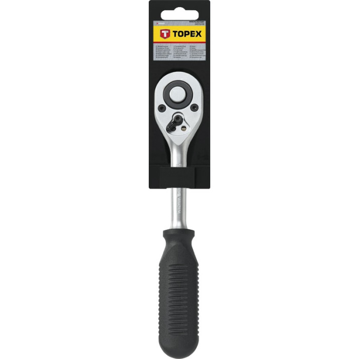Тріскачка TOPEX виготовлена з високоякісної хромованадієвої сталі, що забезпечує довгий термін служби інструменту. Оснащена храповим механізмом з 24 зубцями, а також перемикачем напрямку обертання. Структура рукоятки запобігає вислизання інструменту з руки, що підвищує комфорт роботи. Виконання відповідно до стандарту DIN 3122 є гарантією надійності інструменту. Бренд TOPEX призначений для домашніх майстрів.