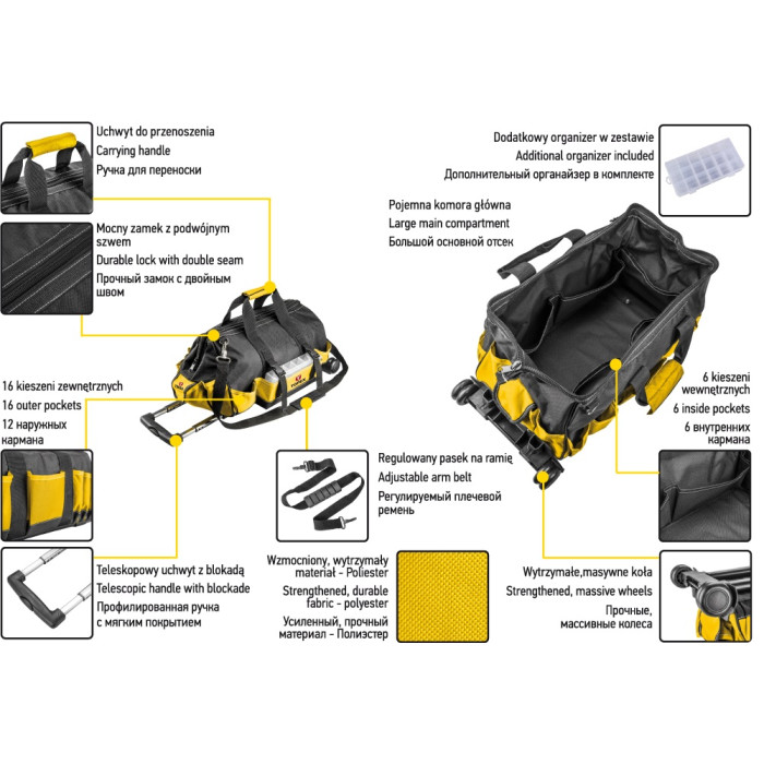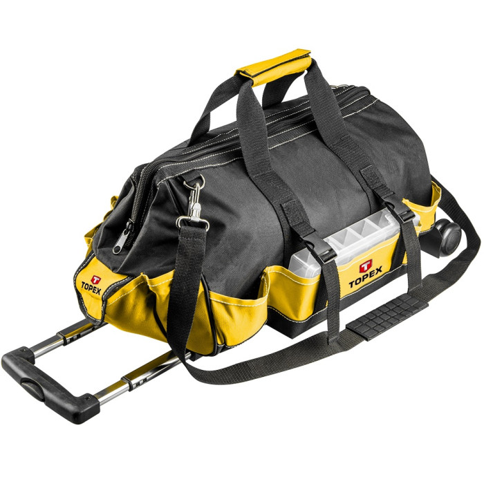 Сумка для інструменту на колесах Topex (арт. 79R449) виготовлена із міцного поліестеру, який гарантує міцність на довгі роки. Зміцнена конструкція, посилені шви і замки. Телескопічна ручка з блокуванням і колесами полегшує транспорт важкого вмісту. Сумка з міцною ручкою. 6 внутрішніх кишень і 16 зовнішніх разом з великим основним відділом забезпечить зберігання і транспортування великої кількості інструментів. Бренд TOPEX призначений для домашніх майстрів.