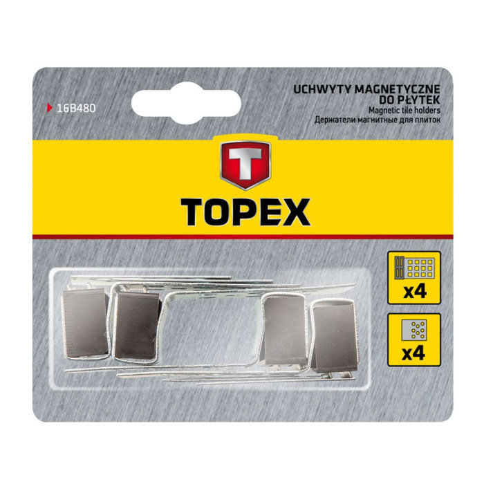 Магніти до кахлю TOPEX використовується під час плиточних робіт. Призначені для кріплення кахлю на профілях. В комплекті постачаються 4 штуки. Марка TOPEX адресована майстрам, які займаються дрібним ремонтом.