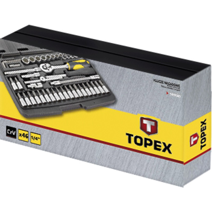 Набір торцевих ключів 1/4” TOPEX складається з 46 елементів, упорядкованих у зручній пластиковій валізці. Всі елементи виготовлені з високоякісної хромванадієвої сталі, що забезпечує подовжений термін експлуатації інструментів. У наборі представлені, між іншим, широка гама насадок, популярних викруткових наконечників на насадках, руків’я для наконечників і тріскотка. Набір широко застосовується у дрібних монтажних роботах, ремонті автотранспортних засобів і обладнання, а також інших роботах вдома та в гаражі кожного майстра. Марка TOPEX адресована майстрам, які займаються дрібним ремонтом.