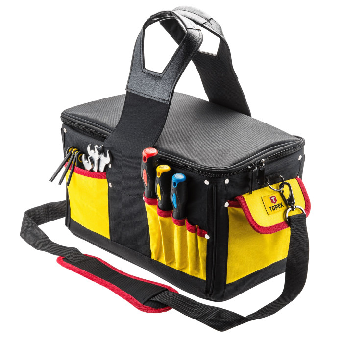 Торба інструментальна TOPEX виготовлена зі стійкого до пошкодження пластику, розмірами 41x23x23 см. Численні кишені ― 16 зовнішніх і 12 внутрішніх ― спрощують впорядковане зберігання інструменту. Має зручні ручки для переношування та наплічний ремінь. Укріплене дно уможливлює переношування важких предметів. Торба замикається на блискавку. Марка TOPEX адресована майстрам, які займаються дрібним ремонтом.