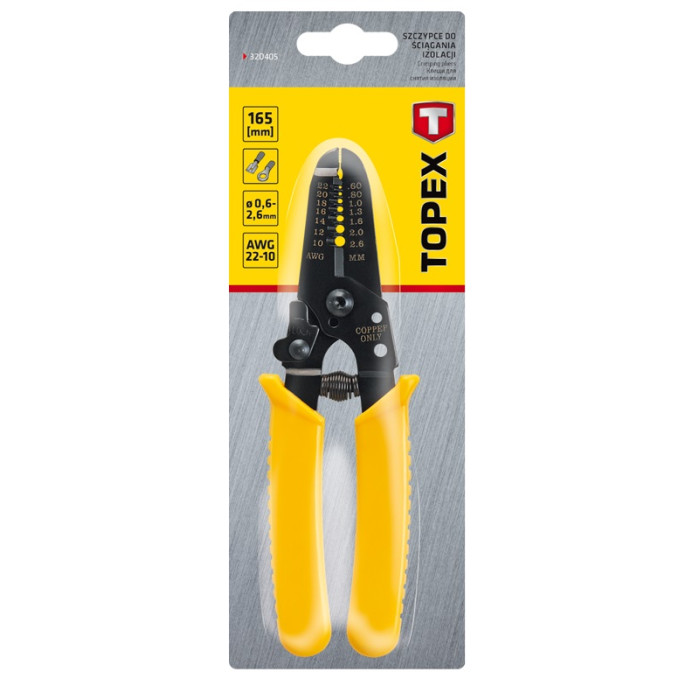 Кліщі для зачистки проводів TOPEX довжиною 165 мм, для проводів діаметром від 0.6 до 2.6 мм². Призначені для обтиску ізоляції. Рукоятки, покриті антиковзаючою пластмасою, забезпечують комфорт під час роботи. Бренд TOPEX призначений для домашніх майстрів.