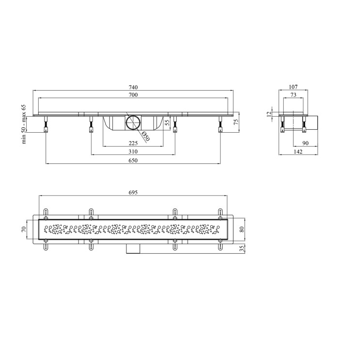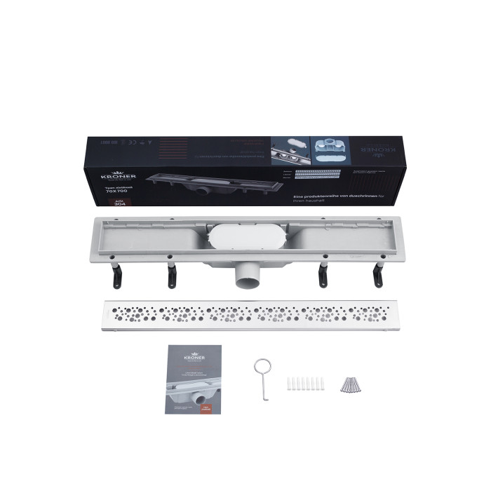 Лінійний трап Kroner KRP Harz M70 Muster з декоративною решіткою розміром 700х73 мм з нержавіючої сталі, виконує функцію водовідведення з душових кабін без застосування душового піддона, на рівні з підлогою. Корпус трапа виготовлений зі стійкого до агресивних середовищ міцного пластику. Також душовий трап має сухий гідрозатвор діаметром 50 мм, який надійно захистить від проникнення неприємних запахів з каналізаційних труб. Конструкція лотка дає можливість без зайвих труднощів почистити виріб.
