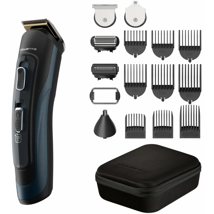Тример Rowenta Selectium, для бороди, вусів, голови, носа, вух і тіла, мережа+акум., роторний мотор, насадок-17, чохол, титан.напил., чорний
