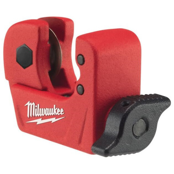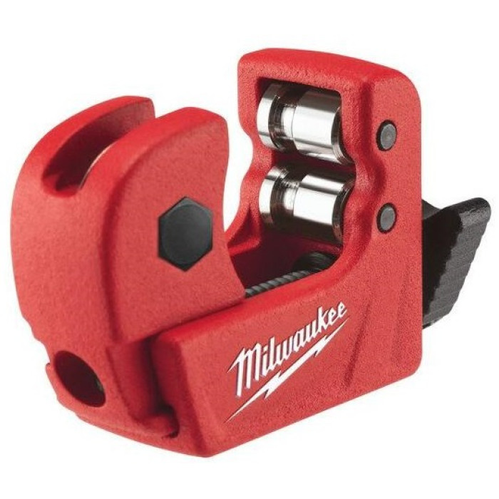 Milwaukee 48229250 — компактний ручний труборіз для мідних труб діаметром 3–15 мм, з хромованими роликами зі спеціального сплаву для довговічного використання. Запатентований гвинтовий механізм регулювання забезпечує швидке та точне налаштування без заклинювань, а зручна накатана рукоятка дозволяє контролювати зусилля однією рукою. Металевий корпус вагою 0,14 кг і розмірами приблизно 125×30×110 мм полегшує роботу в тісних просторах, таких як ніші чи шахти. Інструмент створює чистий рівний зріз без деформації стінок, що робить його незамінним для сантехніків та монтажників.