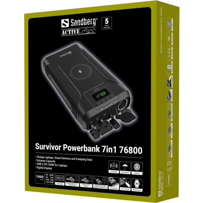 Універсальна мобільна батарея Sandberg Survivor Powerbank 7в1 76800 - це переносна зарядна станція ємністю 76800 мА год. Вона оснащена великою кількістю роз’ємів для поповнення заряду майже усіх ваших портативних гаджетів.