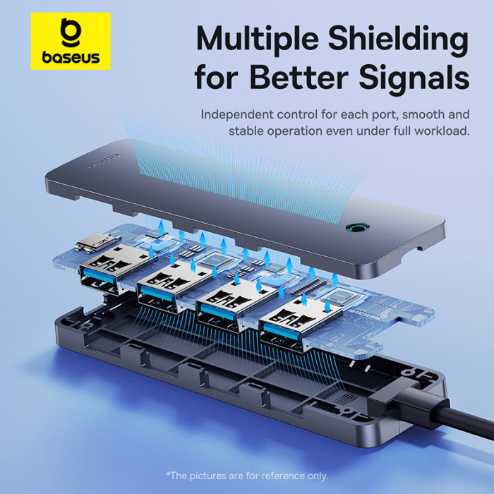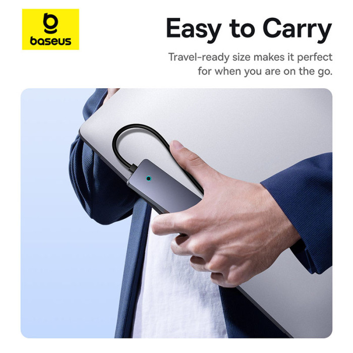 Baseus UltraJoy Series 4-port Lite дозволить вам розширити можливості ноутбука або ПК — лише один раз підключіть USB-концентратор і одразу отримайте чотири швидкі USB 3.0-порти для флешок, мишок або зовнішніх дисків. Завдяки довжині кабелю 50 см ваш робочий стіл залишиться акуратним, а всі пристрої легко підключаться, навіть якщо у вашому ноутбуку мало роз’ємів. Важлива перевага: концентратор компактний, легко поміщається навіть у маленьку сумку.