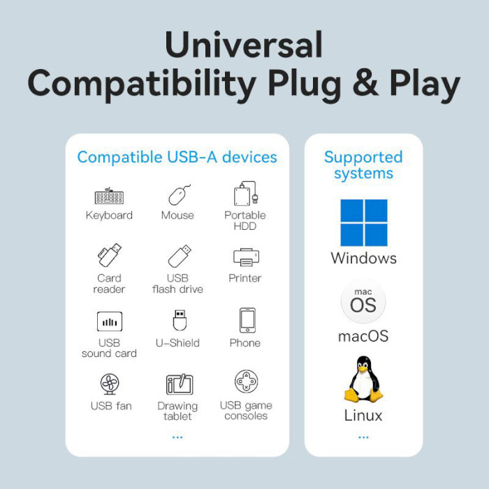 4-портовий USB 3.0 концентраторUSB-концентратор Vention перетворює один USB-порт на чотири, включаючи підтримку USB-флеш-накопичувачів, миші, клавіатури, принтерів і будь-яких інших периферійних пристроїв USB. Він також сумісний зі старими пристроями USB 2.0/1.0.Швидкість передачі даних 5 Гбіт/сЦей USB-концентратор синхронізує дані зі швидкістю до 5 Гбіт/с, що більш ніж у 10 разів швидше, ніж USB 2.0, і дозволяє передати фільм у форматі HD за лічені секунди.Простий у використанніЦей USB-концентратор має вбудовану високопродуктивну мікросхему для захисту ваших пристроїв і даних, а також підтримує гарячу заміну. Не потрібно встановлювати жодного програмного забезпечення, драйверів, підключай і працюй. Підключіть додаткове джерело живлення через порт Micro-USB, якщо ви використовуєте пристрої, що вимагають підвищеного енергоспоживання.Компактний і портативнийUSB-концентратор Vention розроблений таким чином, щоб бути максимально тонким і легким, ідеально підходить для роботи та подорожей з ультрабуком.Широка сумісністьЦей USB-концентратор для ноутбука сумісний з Windows 10, 8, 7, Vista, XP, macOS 10.6-10.12 або новішої версії, Linux 2.6.14 або новішої версії.