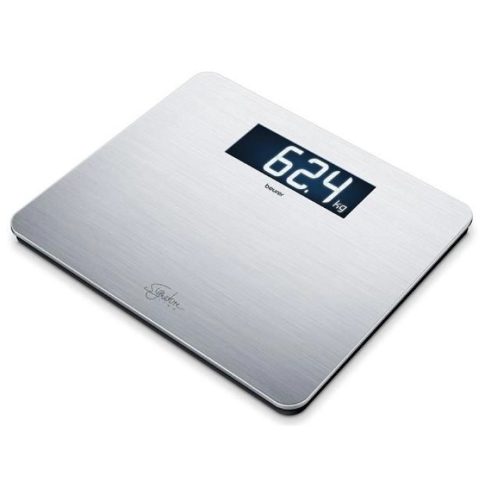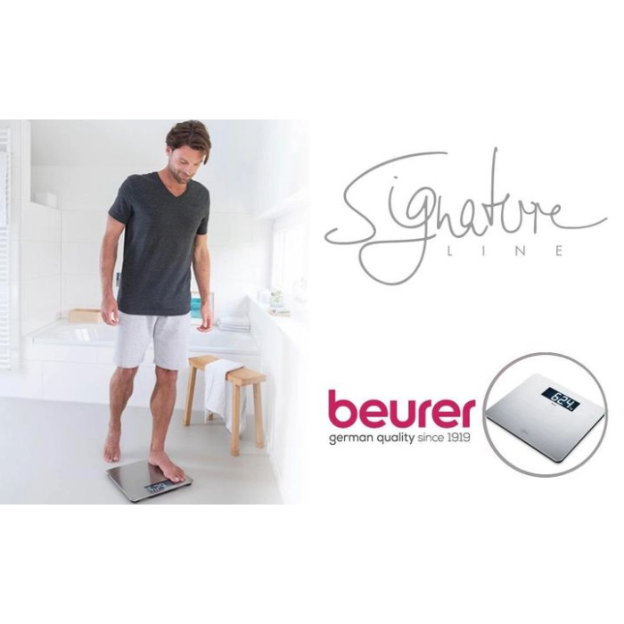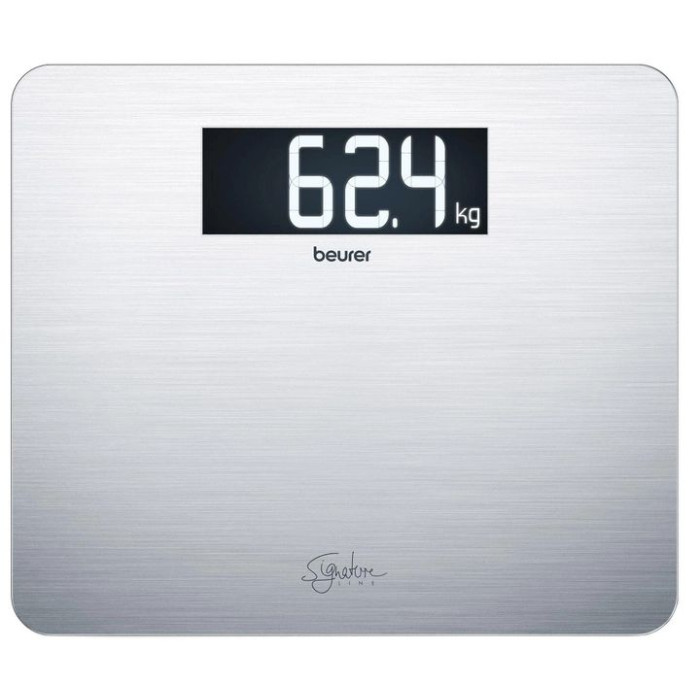 Ваги з покриттям із неіржавкої сталі Beurer GS 405 Signature Line — дизайн і функціональність в одному пристрої! Точні дизайнерські ваги не тільки покажуть результати зважування, а й ідеально впишеться в інтер'єр вашого будинку як декоративний елемент. Велика платформа з міцного скла завтовшки 8 мм зі спеціальним покриттям від відбитків пальців (аnti-fingerprint) з неіржавкої сталі — комфортне й безпечне використання. Цифри збільшення розміру зі спеціально розробленим РК-шрифтом на сучасному чорному дисплеї у форматі XXL з підсвіткою.