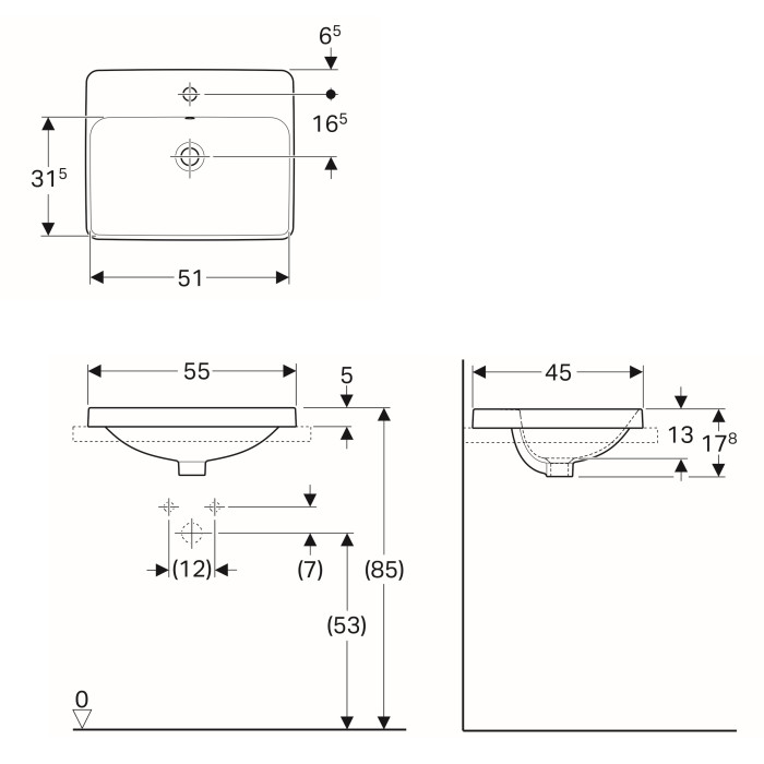 GEBERIT VARIFORM умывальник встраиваемый, прямоугольной формы, 55*45см, с полкой для отверстия под смеситель, с переливом, глазурованный снизу