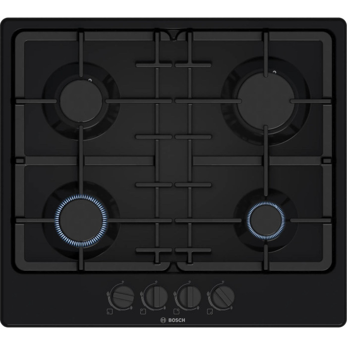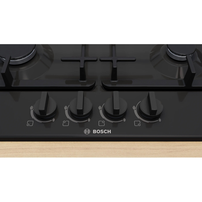 Вбудована газова варильна поверхня Bosch Serie 2 PGP6B6K90R, шириною 60 см, елегантна емальована поверхня в чорному кольорі, 4 конфорки, чавунні решітки, автоматичне електрозапалення та термоелектричний захист від витоків газу.