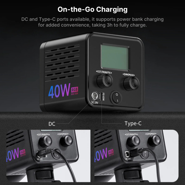 Освітлювач Ulanzi Vijim 40W RGB COB Fill Light (L024 40WRGB) — новий компактний діодний освітлювач від Ulanzi з максимальною потужністю 40 Вт, оснащений власним акумулятором.Освітлювач легкий та компактний, легко поміститься у стандартний кофр та не займе в ньому багато місця. Без знімного рефлектора з байонетом L024 є мініатюрним кубиком 8,5 х 8,5 х 10,5 см і вагою 490 г.Джерелом світла Ulanzi L024 є потужний COB-діод, який видає чистий світловий потік з колірним індексом вище 95% без мерехтіння. Освітлювальний елемент дозволяє регулювати колірну температуру в діапазоні від 2500 до 6500К.Діод має пасивну та активну систему охолодження, пасивна є алюмінієвим радіатором, а коли його не вистачає, то підключається внутрішній вентилятор.На стійку або штатив діодний освітлювач монтується за допомогою стандартної внутрішньої різьби 1/4 дюйма.Освітлювач дуже простий в управлінні, воно здійснюється двома крутилками, одна з яких натискається для перемикання між режимами зміни колірної температури та режимом ефектів. Усі налаштування відображаються на РК-дисплеї з підсвічуванням.Прошивка освітлювача містить 20 світлових сценаріїв. Живлення COB-освітлювача Ulanzi 40WPRO (L024) здійснюється від вбудованого акумулятора потужністю 50,3 Втг (14,8 В, 3400 мАг), а також від мережевого адаптера з параметрами 19 В та 3,42 А.Також можливе живлення від блоків живлення або павербанків та можливістю роботи від зовнішнього джерела живлення з підтримкою PD (Power Delivery) потужністю від 65 Вт.За заявою виробника на максимальній яскравості час роботи від акумулятора становить близько 50 хвилин на максимальній потужності, 70 хвилин на середній потужності, а за мінімальної яскравості — 6 годин.Від 0 до 100% акумулятор заряджається за 3 години.