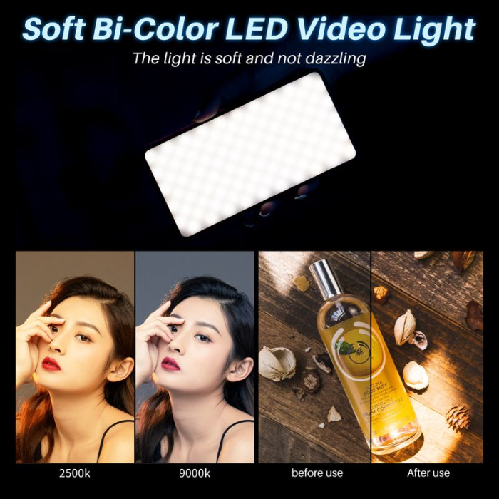 Легке, компактне двоканальне відеосвітло зі знімним силіконовим фільтром, обладнане 200 світлодіодами з індексом передачі кольору CRI 90+, одна половина з яких відповідає температурі 2500К, а інша 9000К. Плавне регулювання між двома каналами дозволяє домогтися будь-якої температури світла в