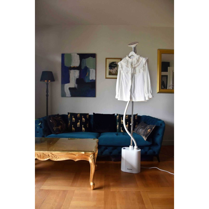 Прилад не займає багато місця, але забезпечує високий ступінь зручності при роботі. Стильний пластиковий корпус приховує ємність для води всередині. Відпарювач можна залишати на увазі, адже він не може зіпсувати вигляд кімнати. Зате у вас завжди буде можливість швидко прогладити чи освіжити потрібну річ перед виходом із дому. А ергономічна стійка з вішалкою дозволяє розмістити потрібний одяг прямо на відпарювачі.