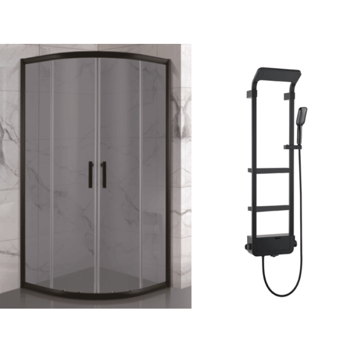 Velvet Душевая кабина 90*90 б/п, проф. черн.мат., стекло серое (4мм), раздвижная 19320802 ASIGNATURA + Unique Душевая панель 85597802 черная ASIGNATURA