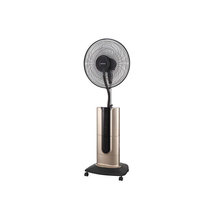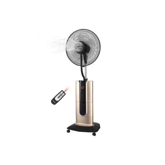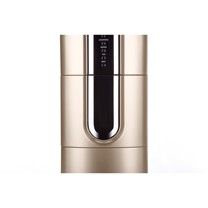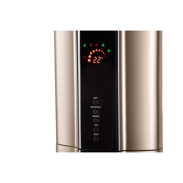 Вентилятор підлоговий золотистого кольору з функцією зволоження. Для зручного керування передбачено дисплей з кольоровою індикацією та пульт ДУ. Модель виконана з надійних, практичних і довговічних матеріалів, а в якості підставки використовується платформа з колесами.