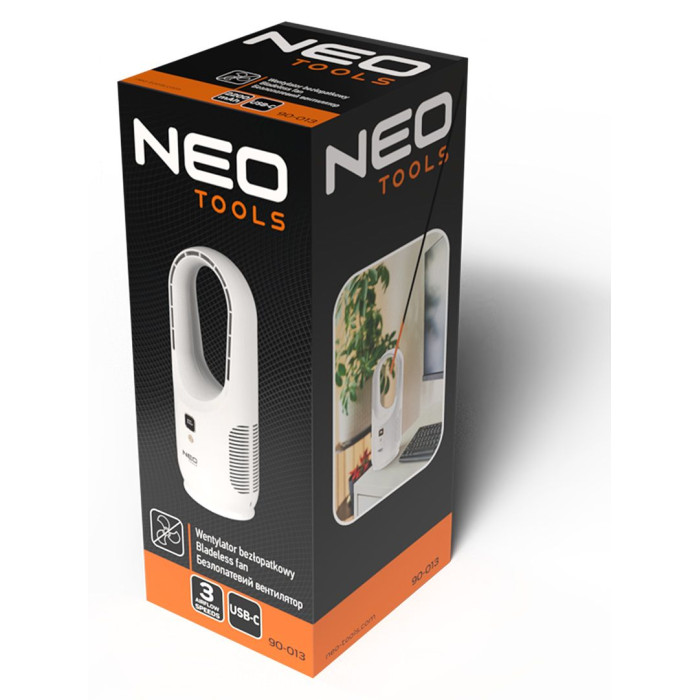 Аккумуляторный настольный беслопастный вентилятор 90-013 от NEO TOOLS - это устройство, работающее от аккумуляторной батареи емкостью 2200 мАч. В нем предусмотрено три скоростных режима. В зависимости от выбранного уровня время работы вентилятора варьируется от 3 до 12 часов.