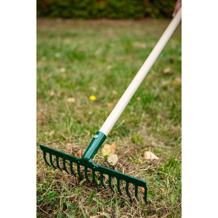 Граблі універсальні прямі, 14 зубців, клепана головка, дерев'яна ручка 15G057 від VERTO - це граблі з 14 практичними зубцями, розташованими на клепаній головці. Дерев'яна пряма ручка забезпечує зручність використання. Граблі марки VERTO характеризуються загальною довжиною 1400 мм і вагою 1,4 кг. Рекомендуються для багатьох застосувань.