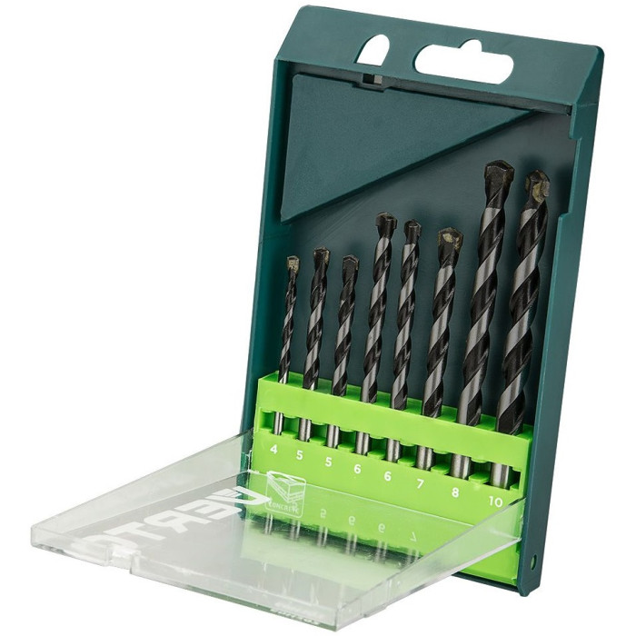 Свердла по бетону VERTO (арт. 60H302), набір 8 шт., розміри від 4 до 10 мм, із твердосплавними напайками на наконечнику, що характеризуються збільшеною стійкістю до високих температур. Шліфована спіраль свердел зменшує опір під час свердлення.